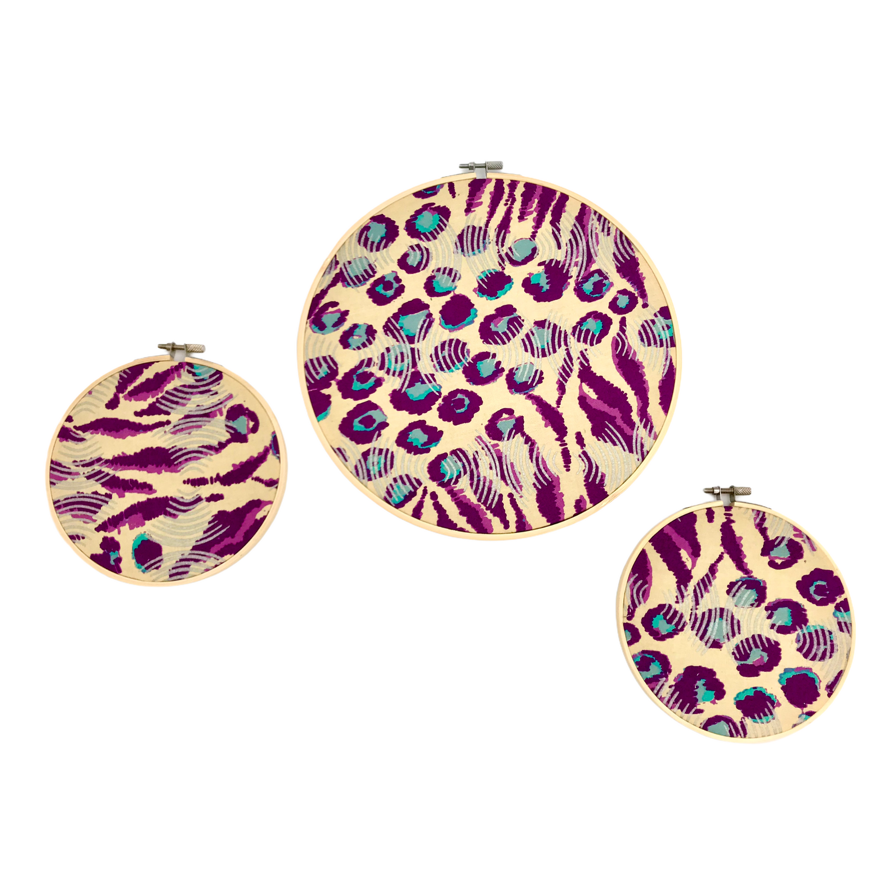 Personnalisez vos espaces, même les plus petits, avec ce wall-art original qui habille vos murs d'une pointe d'esprit girly avec ce wax blanc et violet au motif léopard, délicatement tendu dans un cercle à broder en bambou.