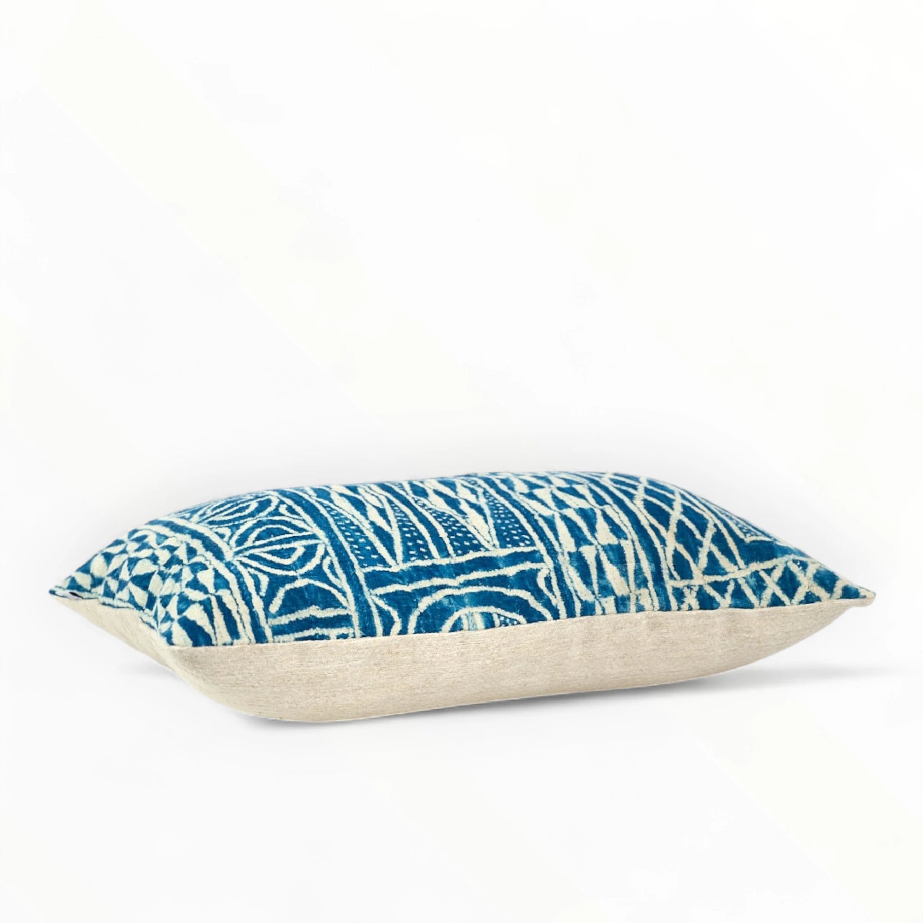 Le coussin FO réunit deux textiles d’exception : un Ndop royal camerounais, teint à l’indigo naturel, et un lin texturé du nord de la France.