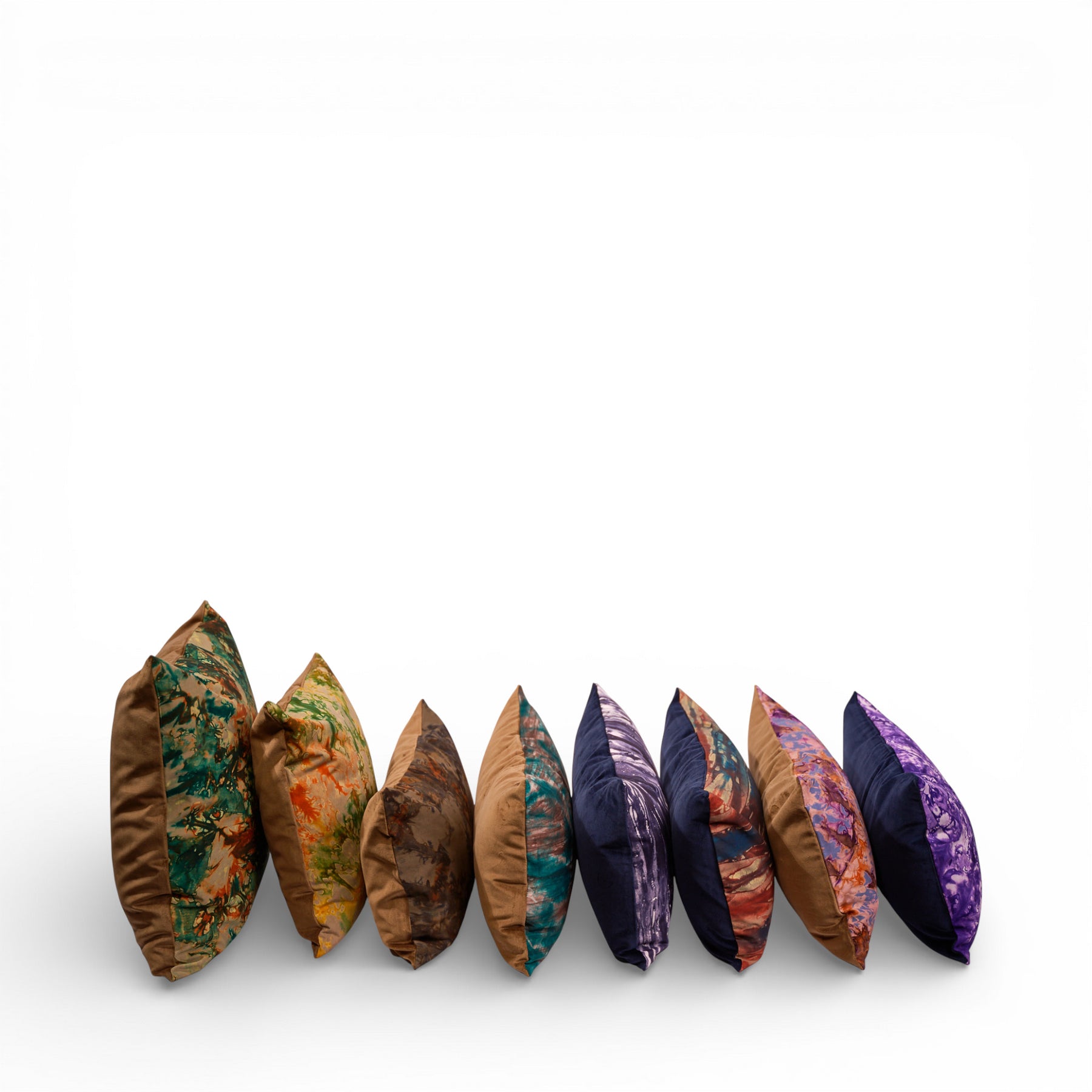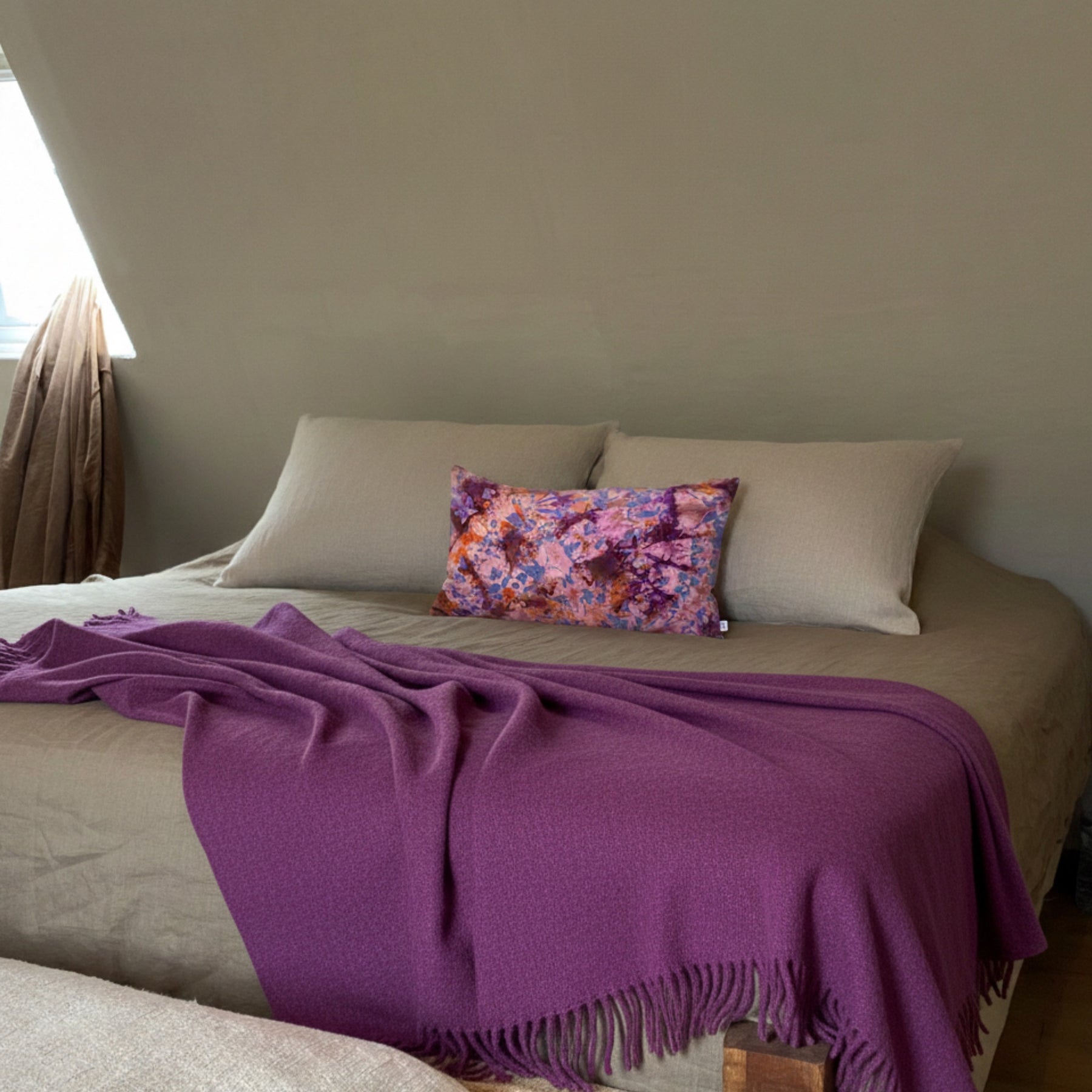La housse KUMASI AURORE révèle une palette vibrante de lavande lumineuse, de violet profond et d’éclats cuivrés. Le textile, teint artisanalement au Burkina Faso, développe des motifs organiques et des nuances subtiles propres au travail manuel.
