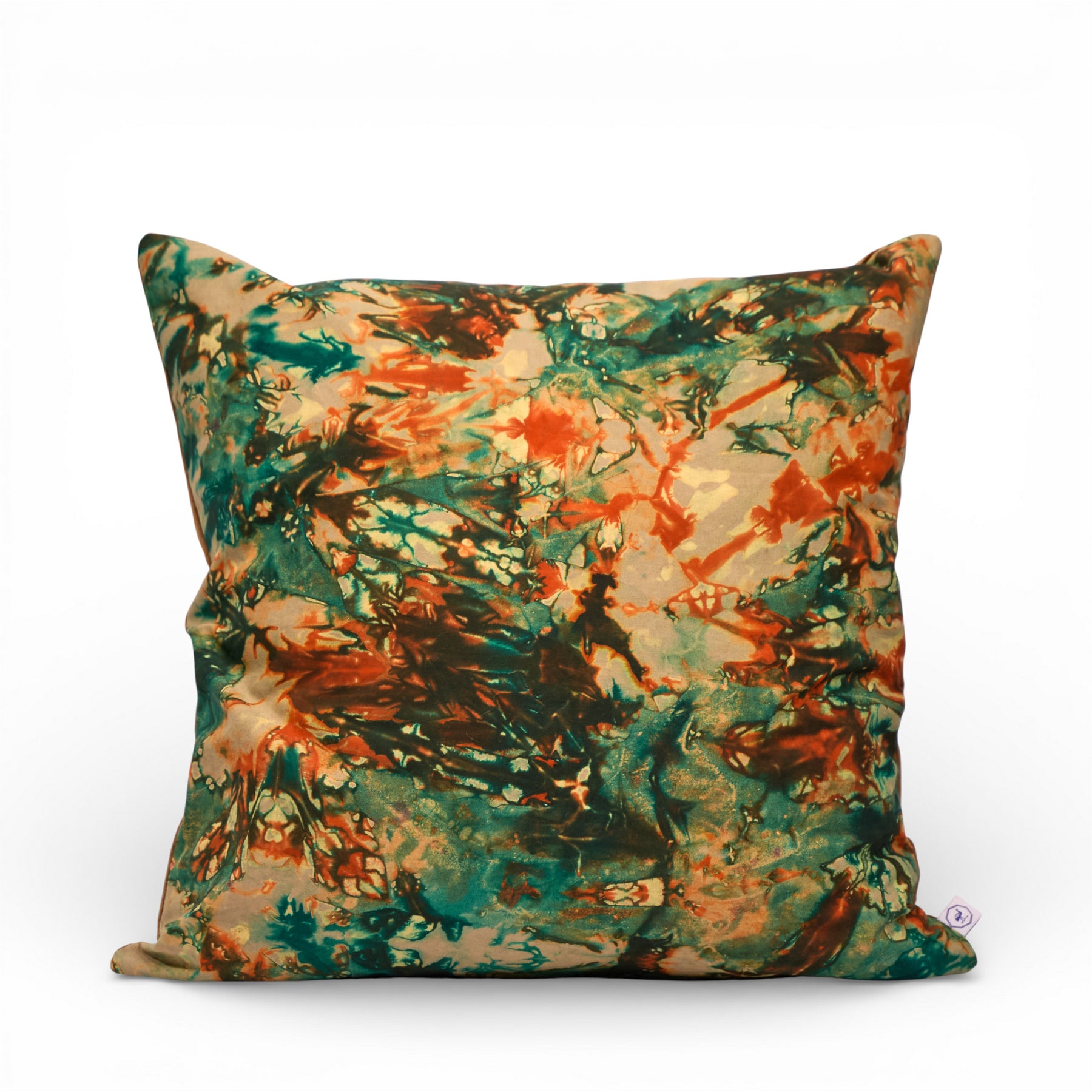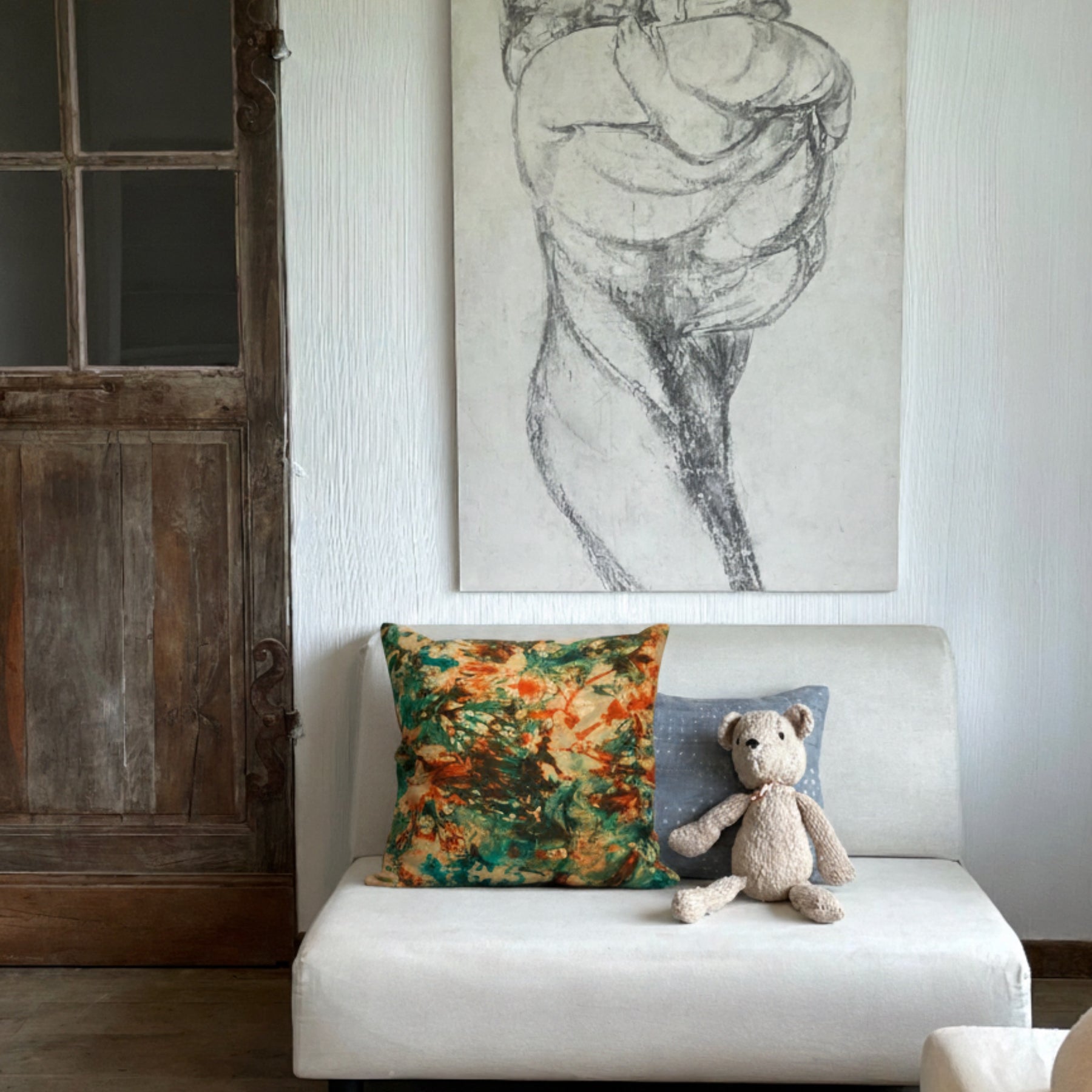 Le dos en velours de coton lisse coloris noisette apporte chaleur et équilibre. Son toucher dense et mat adoucit l’intensité du motif tout en conservant une présence forte.