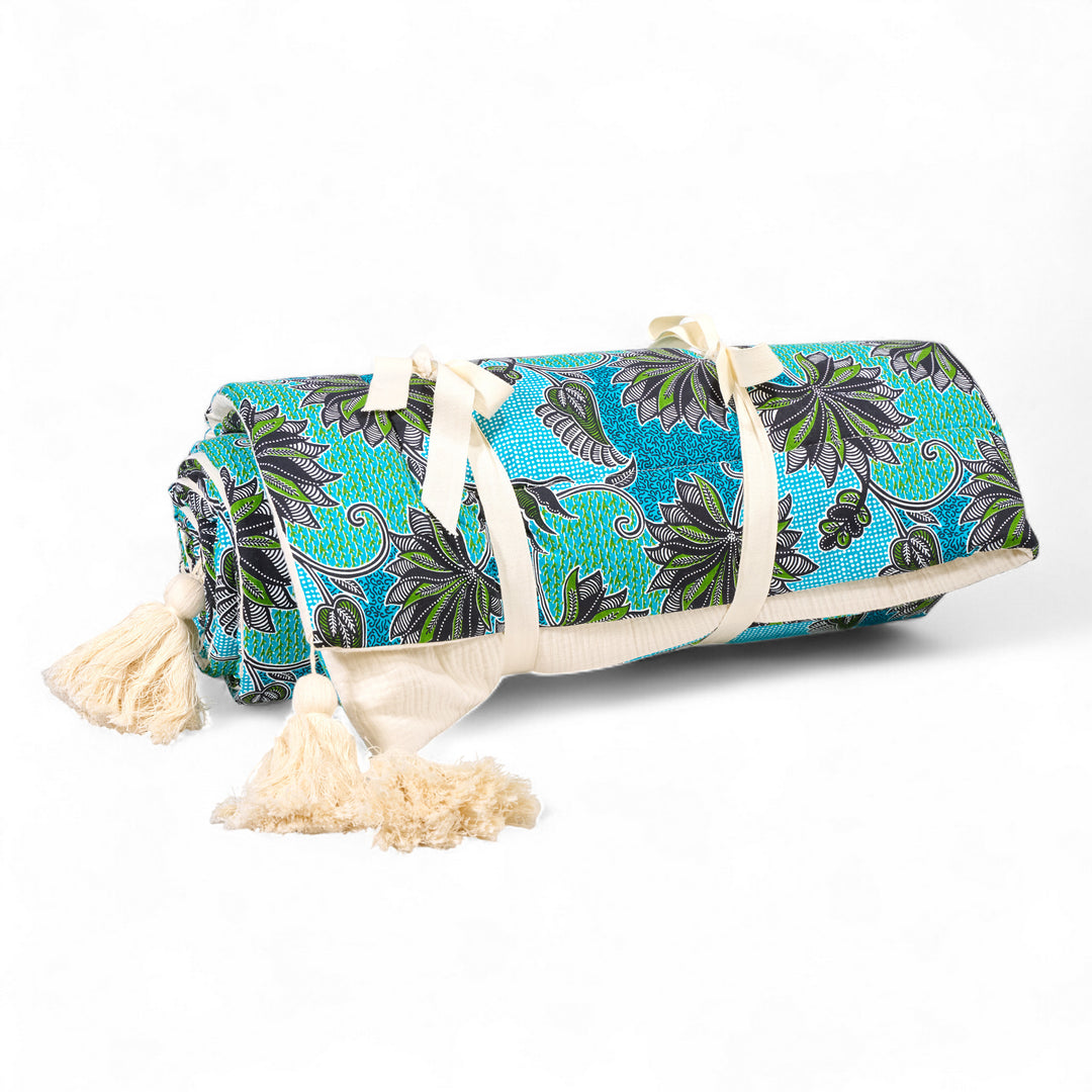 Couvre-pieds Couvre-pieds ALA-NDOTO par Studio Matongé en wax de coton écossais bleu, écru et chocolat. Notre couvre-pieds est doublé d'une douillette double gaze et rehaussé d'élégants pompons de coton écrus.