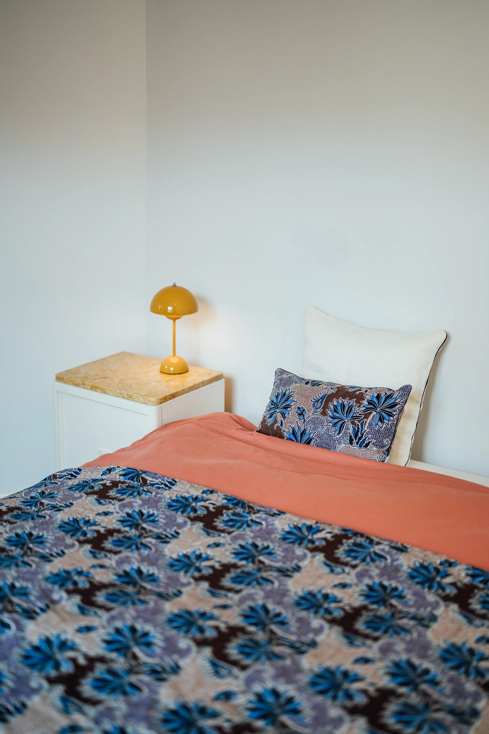 La housse NDOTO peut être associée à la courtepointe du même nom aux  légants motifs floraux noirs et cobalt pour sublimer un lit ou un sofa.