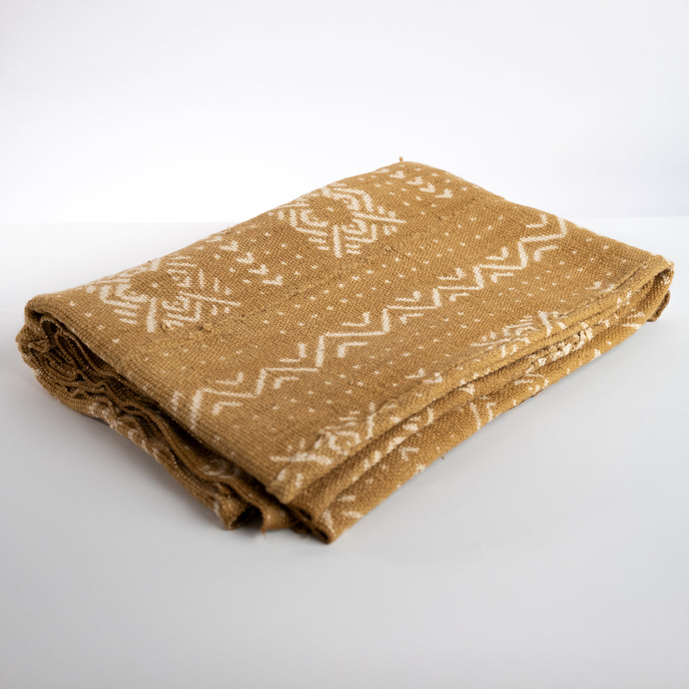 Plaid en bogolan de coton ocre ARDHI. Motifs ethniques écrus. En coton bio filé, tissé, teint et décoré à la main par nos artisans dans la région de Ségou au Mali. Approximativement 153 x 117 cm.