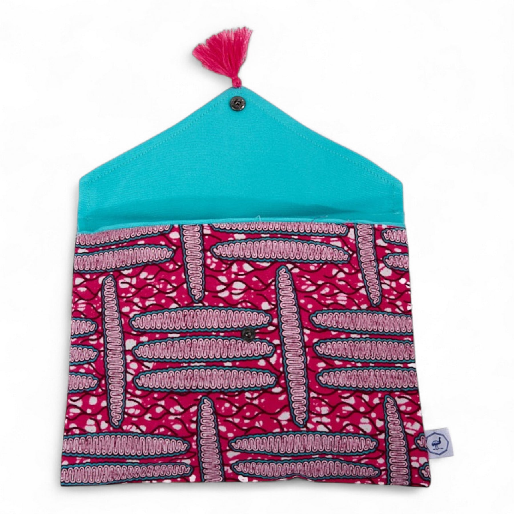Pratique, vive et élégante, la pochette SULA-WODE vous accompagne au quotidien pour ranger bijoux, souvenirs ou lingerie. Son tissu wax rose et turquoise est mis en valeur par un pompon en coton fuchsia et une doublure turquoise éclatante.