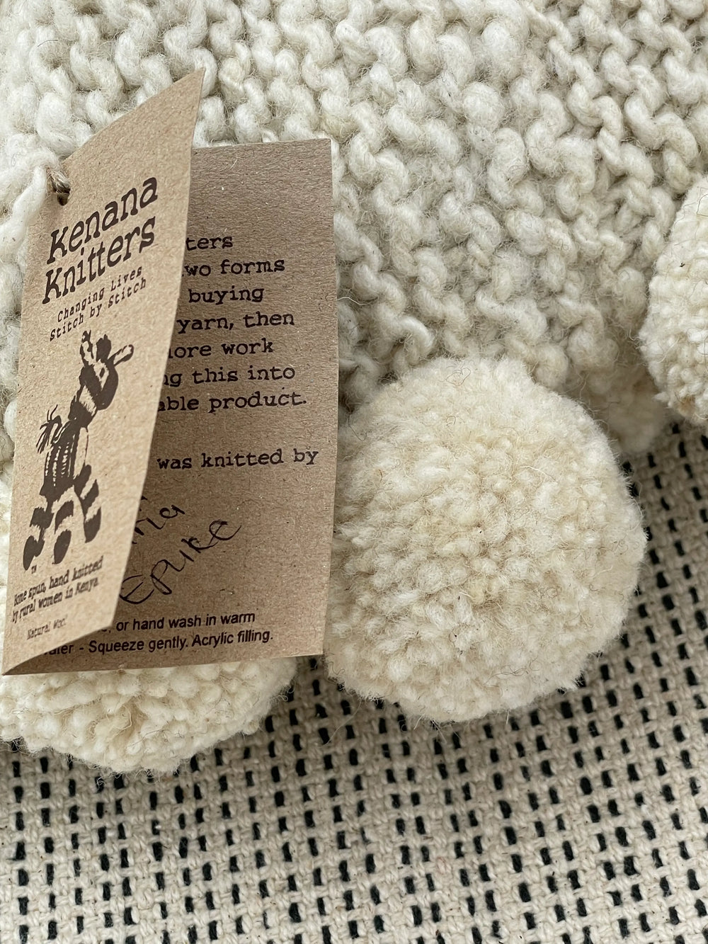 Coussin rond à pompons écru BONBONSI en pure laine mérinos, 30 cm de diamètre. Tricoté main par Kenana Knitters pour Studio Matongé. Disponible en 2 tailles (30 cm et 50cm de diamètre) et 3 couleurs (blanc écru, beige et marron foncé). Insert fourni