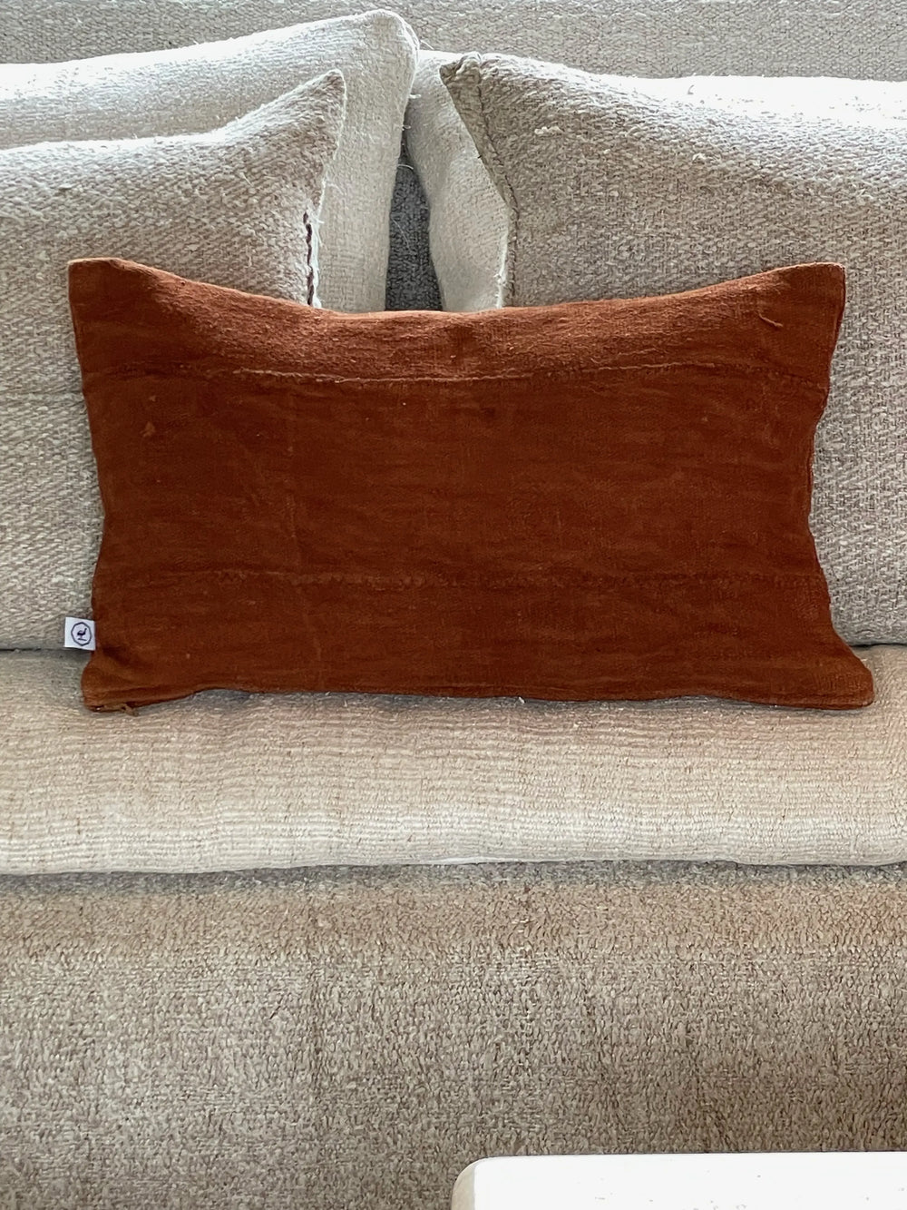Housse de coussin terracotta en bogolan de coton bio par Studio Matongé. Pièces uniques tissées, filées et confectionnées à la main. Format rectangle 30 x 50 cm. #terracotta