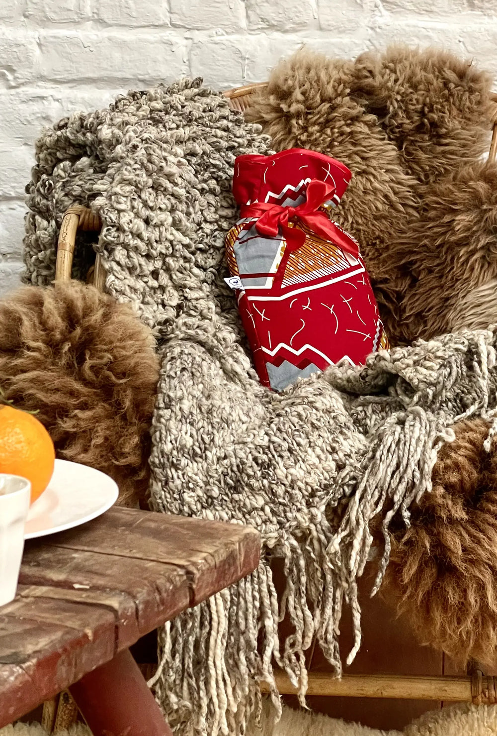Élégante chambre à coucher avec la housse de coussin NZETE en bogolan de pur coton bio, gris (50 x 50 cm,  plusieurs tailles disponibles), la bouillotte JAMAC modèle Fougères, le plaid NAMTCHEMA N°1, pièce unique  en tissu Ndop vintage (tissu royal de l'ethnie Bamiléké du Cameroun) et le tirage photo en édition limitée et numérotée de l'oeuvre Bijoux de Famille par Ana Bloom, issu de la série Résistances Végétales.