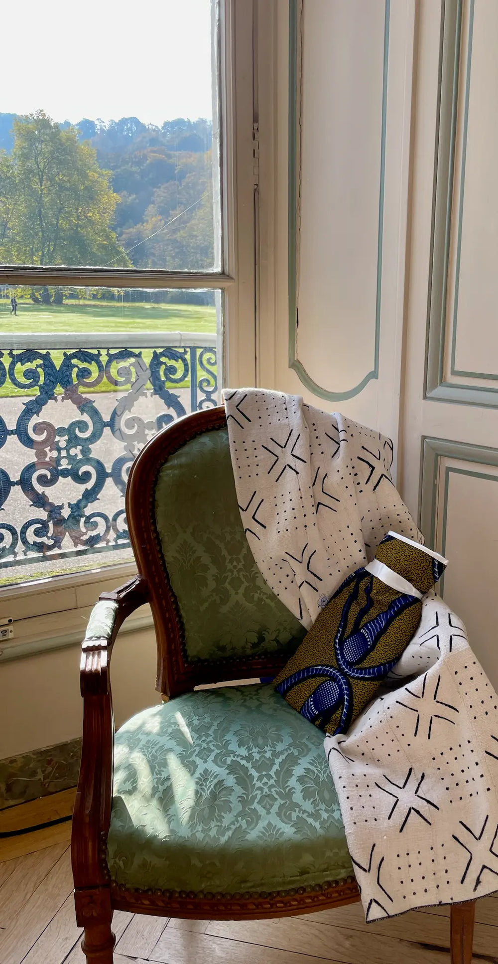 Dans les magnifiques décors du grand foyer de l'Opéra de la Monnaie de Bruxelles, housses de coussins FO - Studio Matongé. Versatiles, nos coussins bi-matières s'adaptent à vos envies : une face en ndop vintage de coton bio ornée de motifs ethniques tracés à la main et une face unie en épais lin beige.