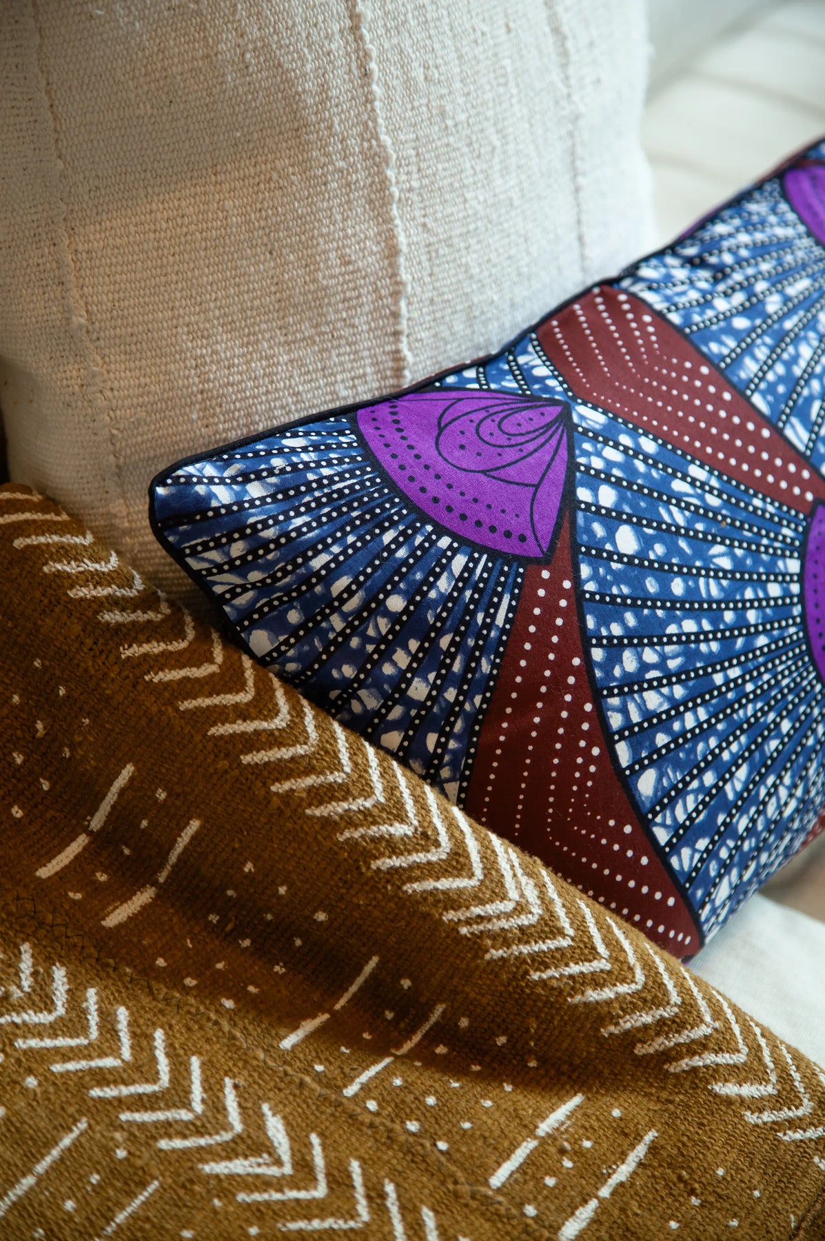 Housse de coussin ethnique SANAA en wax multicolore aux dominantes bleues, bordeaux et violet par Studio Matongé. 100% coton - Disponible en différents formats et dimensions.