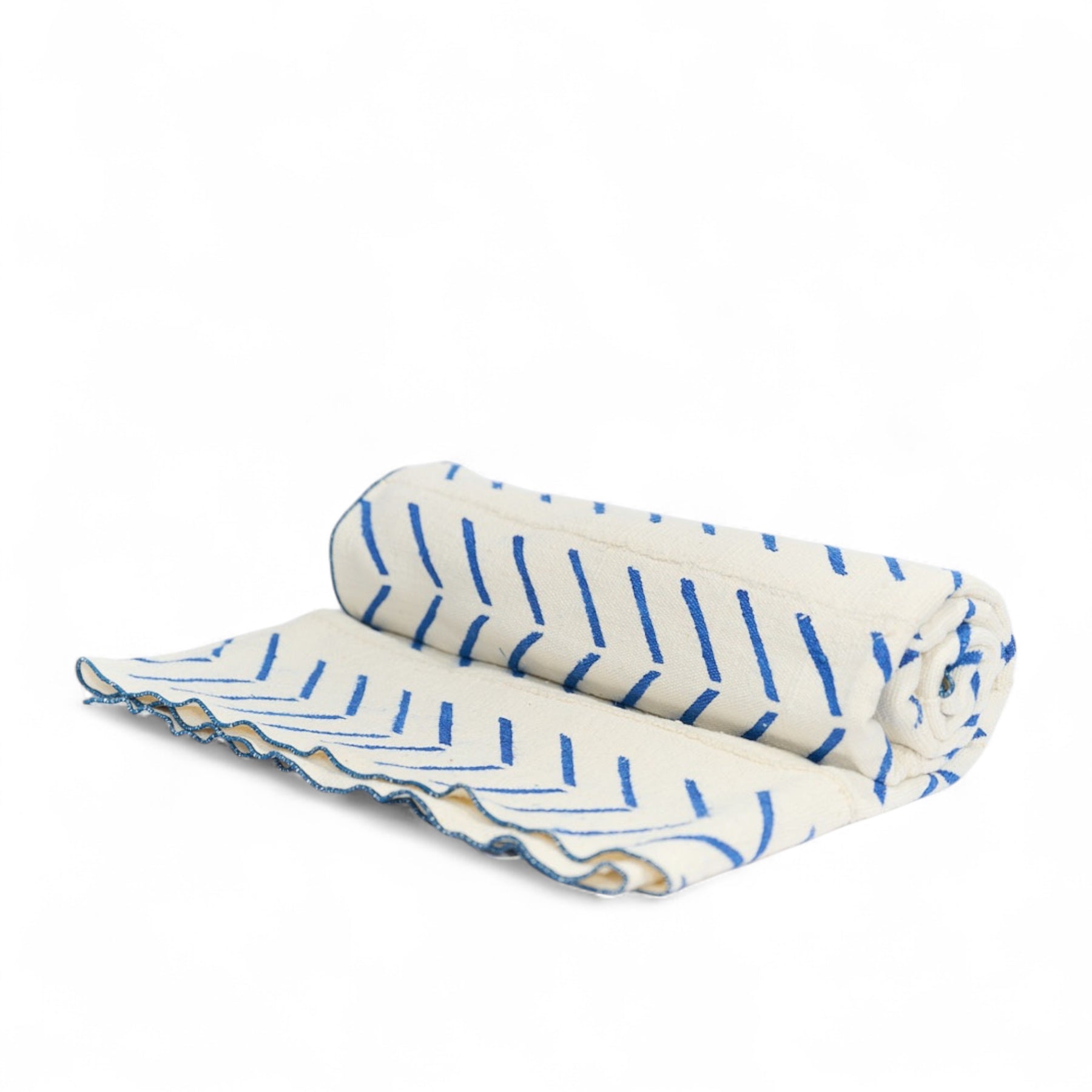Plaid FEMI-OKUN en bogolan blanc à motifs bleus en forme de flèches stylisées. Tissé et orné à la main au Mali. Finition au point de bourdon coordonné réalisée artisanalement en Belgique