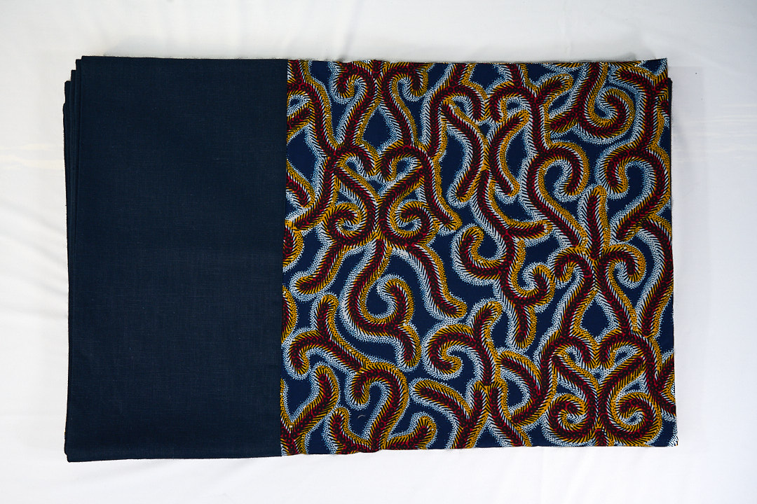 Elle marie un centre en wax aux motifs entrelacés dans des tons de bleu, bordeaux, blanc et jaune, avec de larges bordures en lin lavé marine qui équilibrent l’ensemble avec élégance.