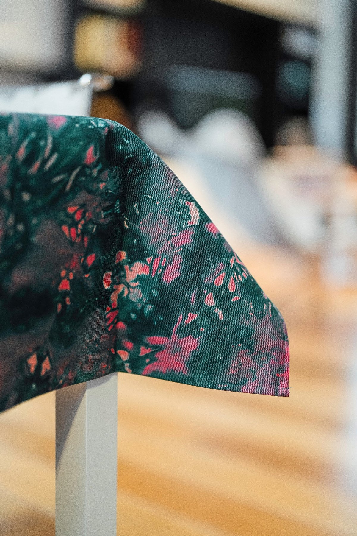 The tablecloth DUNDA BOUGAINVILLEA It blends a deep green with a vibrant pink, in a fresh and joyful floral palette. Hand-dyed with Burkina Faso Using the traditional kokodunda technique, it reveals nuances and organic patterns that make each piece unique. totally unique.