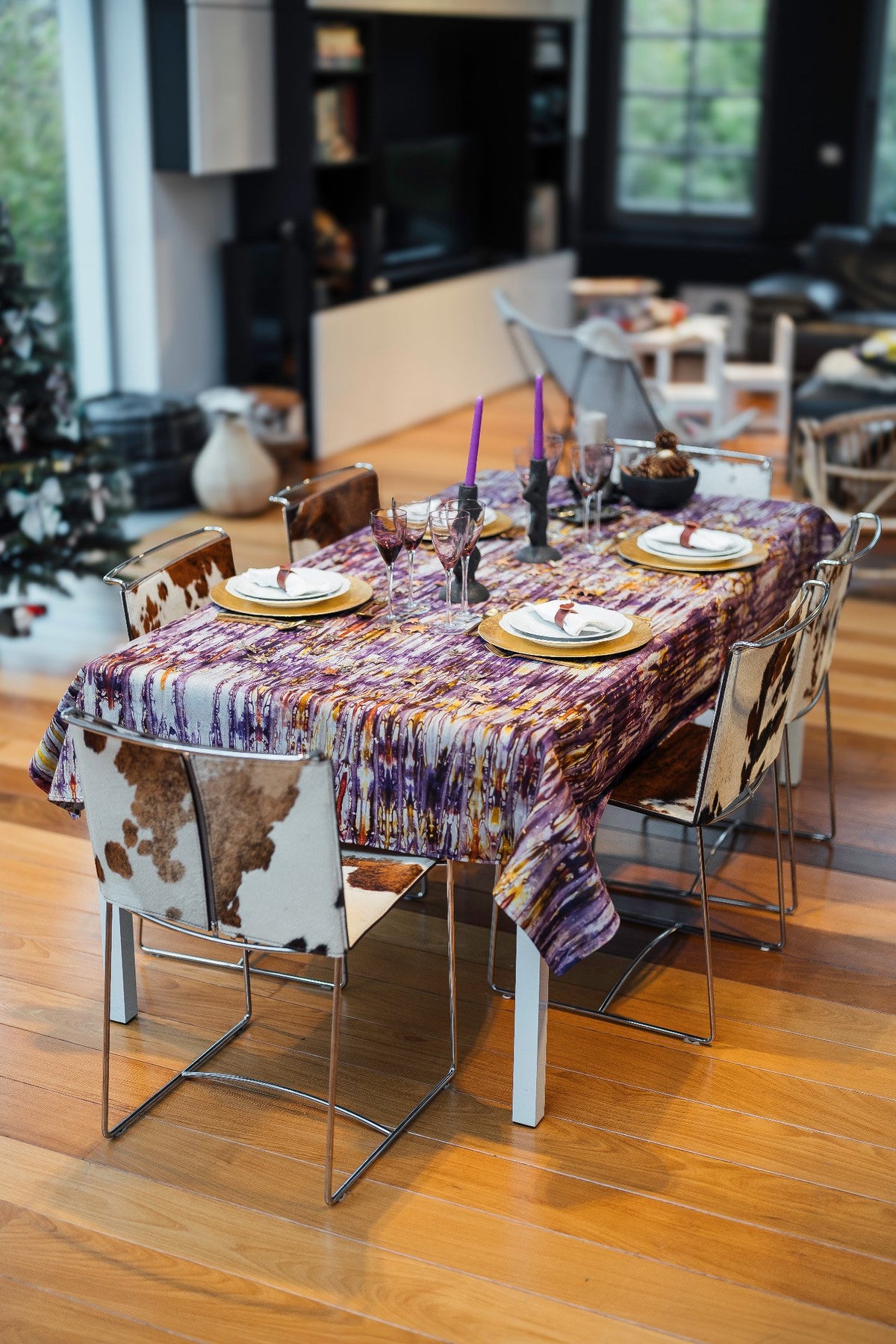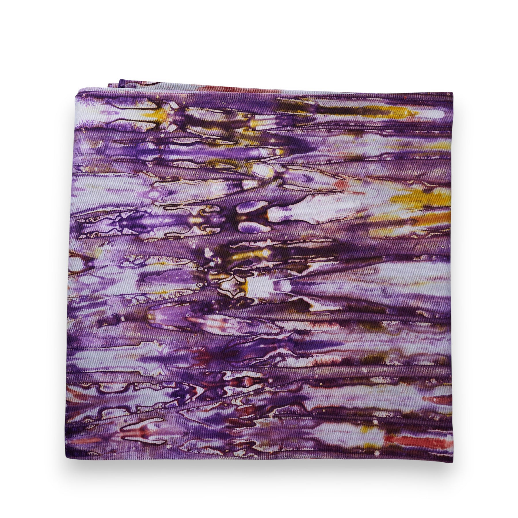 DUNDA IRIS It blends a deep purple with a luminous yellow in a vibrant and expressive harmony. Hand-dyed. Burkina Faso Using the traditional kokodunda technique, it reveals contrasts, nuances, and irregularities that bear witness to the artisanal craftsmanship. Each tablecloth is a unique pieceimpossible to reproduce.