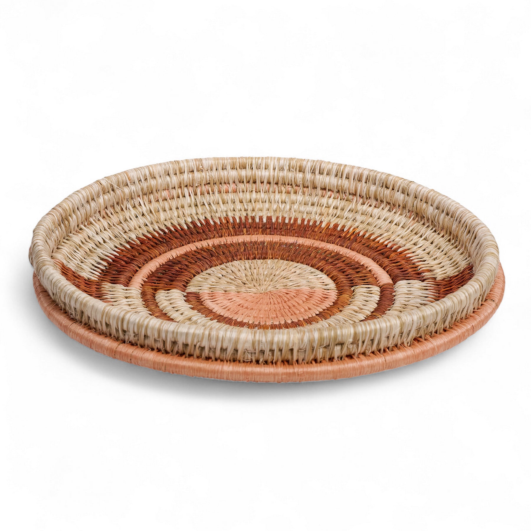 DIMENSIONS : - Petit : 33 cm de diamètre · 6 cm de hauteur - Moyen : 45 cm de diamètre · 6 cm de hauteur Chaque pièce est réalisée artisanalement. Les teintes, dimensions et motifs peuvent varier légèrement.