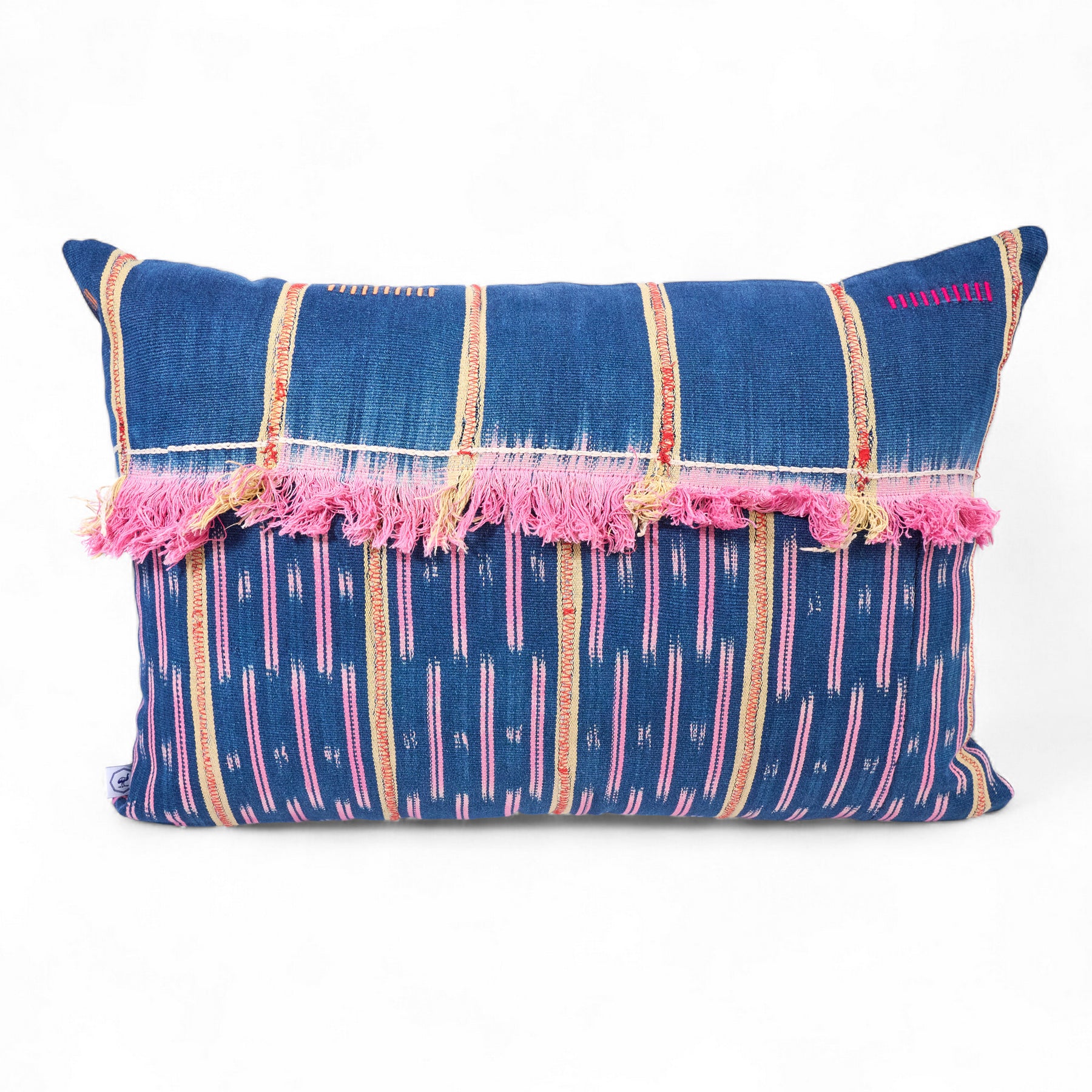 Tissage ivoirien ancien et denim brut se rencontrent dans cette housse de coussin à la personnalité vibrante.